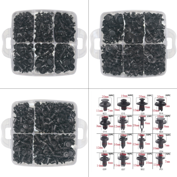 ΠΛΑΣΤΙΚΕΣ ΠΙΝΕΖΕΣ ΚΛΙΠ ΚΙΤ 16 ΜΕΓΕΘΗ 620ΤΕΜ.Χαρακτηριστικά:Τοποθέτηση σε όλους τους χώρους του αυτοκινήτου (αριστερά, δεξιά, μπροστά, πίσω)Κατασκευασμένα από υψηλής ποιότητας πλαστικό, ανθεκτικές με μεγάλη διάρκεια ζωήςΕύκολα στη χρήση και την εφαρμογή620 τεμάχια σε μαύρο χρώμαΔιαστάσεις: 15,5 x 15,5 x 12,7 εκ.Βάρος: 825 γραμ.Η συσκευασία περιλαμβάνει:20 x B23 (1235)30 x C15 (1131)25 x C20 (0170)20 x B14 (1119)30 x C14 (0194)90 x C05 (0194)15 x B17 (1184)25 x B04 (1117)25 x B10 (1118)20 x B08 (1116)50 x C31 (3122)50 x C04 (0119)30 x C09 (0137)90 x C07 (0180)30 x B02 (1113)70 x P01 (0101)